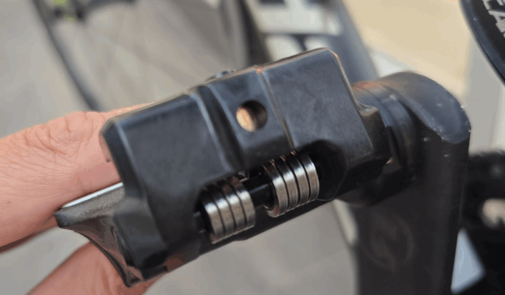 בתוך הציר יש מדדי עיוות וחיישנים למדידת כוח וקאדנס, יחד עם פיצוי טמפרטורה כדי לשמור על דיוק הנתונים. מאחור נמצא מנגנון הקפיץ המוכר, עם בורג כיוון קטן למפתח אלן 3 מ״מ – סיבוב אחד ימינה או שמאלה משנה את מתח השחרור של הקליט מהפדל.