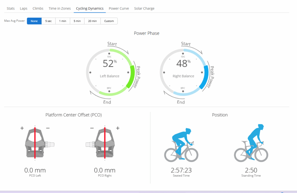 - Power Balance – חלוקת ההספק בין רגל שמאל לימין. נתון חשוב שמאפשר לזהות חוסר איזון או פציעה מתקרבת.